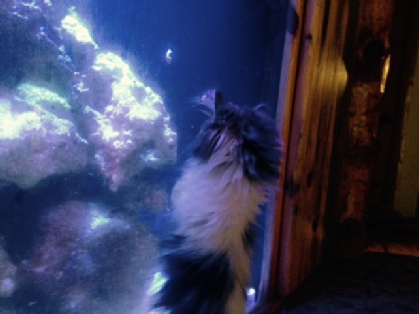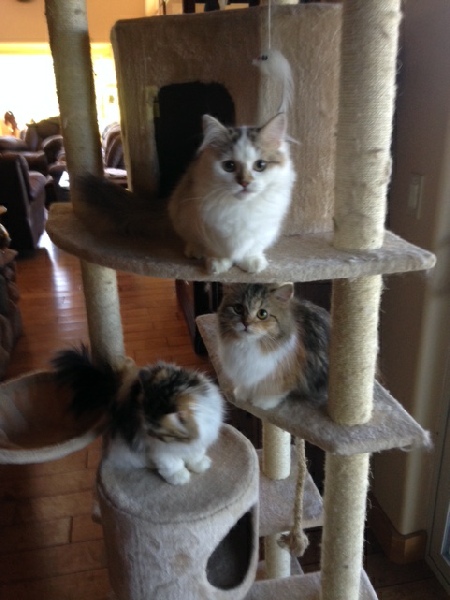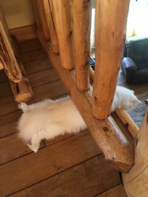 (Right) Sydney hanging over the bridge overlooking the living room. We always get goose bumps when one of the cats do this.