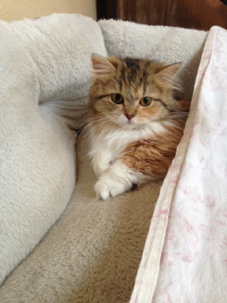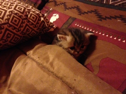 Josie had a tendency of moving her kittens onto the bed. Below, she tucked Gidget into bed. This picture was not staged.