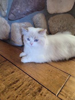 Katy on the hearth after a show bath before going to Las Vegas for a show. Katy loved to show. She sadly passed away from her health problems before she was two years old.