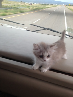 Ellie’s first road trip ever (right), when she was only three months old. She mastered the dash of the RV easily. Ellie came to us very skinny and we did a lot of work to get her in shape.