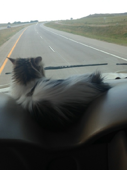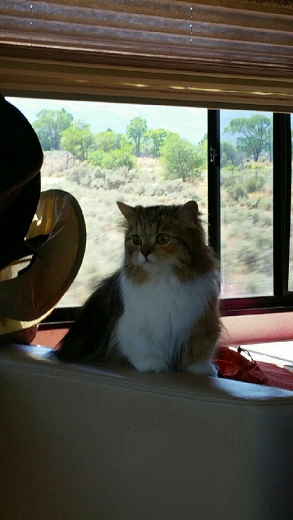 Bing enjoys the best seat in the house during her RV trip to Cheyenne, WY for a cat show.
