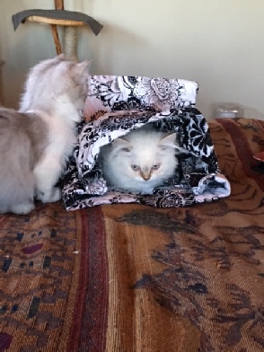 (Right) Ellie and Katy playing in the kitten pouch I made for them. Katy is clearly not happy with sharing the pouch that Ellie wants for herself.