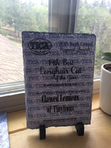 Clawed Lemieux of Tiny Lions (Claude) received annual regional awards for the best longhair Minuet (chocolate mackerel tabby and white) of the South Central Region, 2017, and best Minuet kitten and best Minuet cat of 2017, South Central Region. You go, Claude!!!