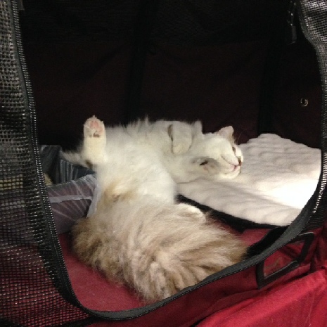 My husband and our four dogs went with me and the cats to Tucson, AZ for a Ragdoll congress cat show. Coming off his best show in Corpus Christi, we were truly disappointed with his results. He had to go up against 51 ragdolls, along with all the other breed kittens (101 entries), and he did not final even once. I shouldn’t make excuses for him, but we were benched next to a female cat that proved to be in heat. That got Claude’s hormones raging and he was a little rambunctious, which didn’t make the judges happy. The good new is that he appears to be all male.