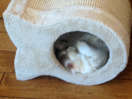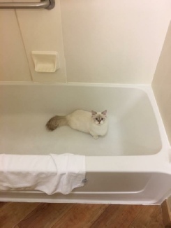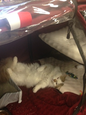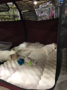 It was the kittens’ first road trip and they did extremely well. Kubi and Gidget had to stay in a travel playpen at the hotel–flipped over, since Kubi proved to be a quick study at escaping. He climbed up the side in an instant and tried to tumble over the top.
