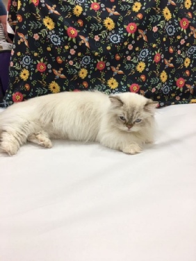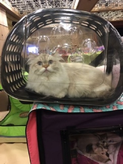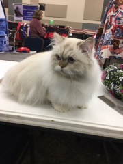 Claude, even being a grump with the judges, finaled once, fifth in special breed. He is an amazingly beautiful cat that should final more if it wasn’t for his poor attitude on the table. Several judges have said that they would have finaled him if he hadn’t been grumbling. He loves traveling but he is not a fan of being judged (who is?). I think his last show will be the Denver show in October (2017) since he is not enjoying the circuit. By then, Katy will be able to show and can keep Ellie company.