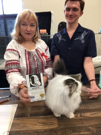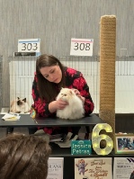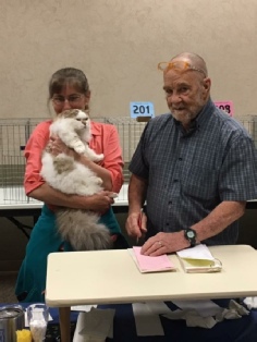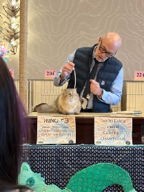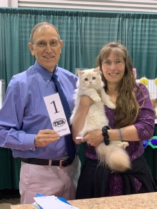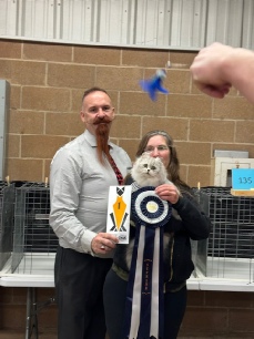 Claude’s first show in adult championship was also his first show in 2017. We made a trip out of our region, to the Great Lakes region, so we could return Riddle Me This (Riddler) to his owner, Samantha McConnell, of Pawcity Cattery. A friend who raises Norwegian Forest cats went with us and we had a blast.