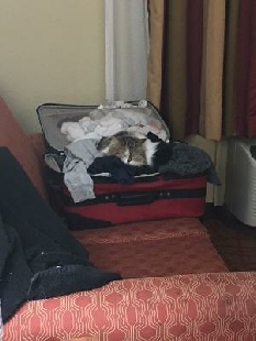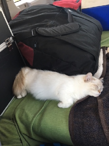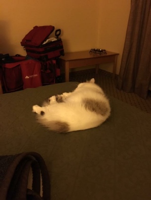 Foxxy adjusted well to the hotel and didn’t make a peep during the flight. But she had the run of the car in the car ride.
