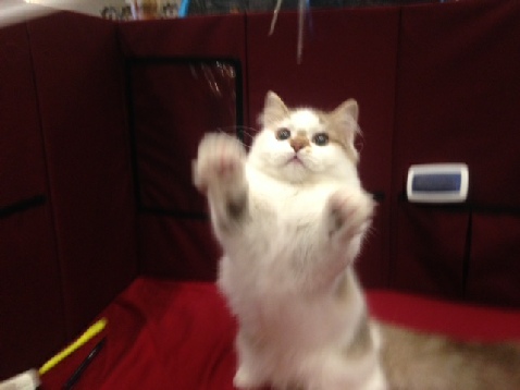 I took Cosette, Foxxy, Mattie, Sydney and Lexie to a show in Rosenberg, TX and it was extremely hot. Our hotel never got below 73 degrees and it was miserable being so hot at night. But the show went well and we had a great time. It was Foxxy’s first show she could compete in and she kicked butt. She finaled 11 out of 14 times, which is incredible for a four month old kitten. Cosette did okay, finaling in every ring, but that was just expected, since there were only six household pet kittens competing on Saturday and five on Sunday. She didn’t do so well on Saturday, and I noticed it was because she wasn’t playing, but kept falling asleep. So I tried something on Sunday to keep her awake. I fed her her favorite food pellets a few every hour and that gave her enough energy to stay awake and play. She started to play and got higher finals. I think we found her secret.