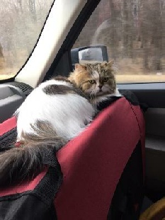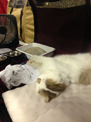 Claude finaled twice in the Cleburne show, taking 10th out of 42 cats and 4th out of 15 long hair cats. He probably could have done better without the attitude, but he still grumbles when the judges take him out of the judging cages. I don’t understand it, because he’s a doll with spectators at the show and a sweetheart everywhere else. It’s just in the judging ring that he changes his tune, and this is why I’m looking for another cat to show. Once I have one, I’ll retire Claude from showing. It’s a shame, because he hasn’t supremed yet–and probably won’t because of his attitude–but he’s not having fun with the judges. However, he really does love traveling. He has a blast at the hotels and in the car.